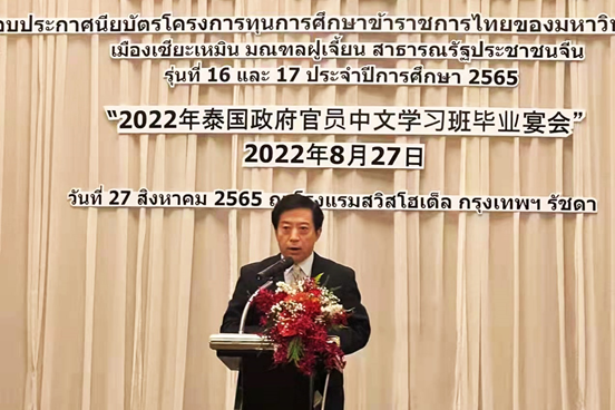 8月27日晚,由泰中文化经济协会、beat365英国官方网站和beat365英国官方网站泰国官员校友联谊会联合组织的“2022年泰国政府官员中文学习班毕业宴会”在泰国举行。中华人民共和国驻泰王国特命全权大使韩志强,泰中文化经济协会副会长兼协会教育委员会主席尼空,以及来自泰国国防部、皇家警察、移民局、工信部、财政部、社会发展和人类安全部等的官员出席毕业宴会。beat365党委书记徐西鹏录制视频表达对学员们的祝福。