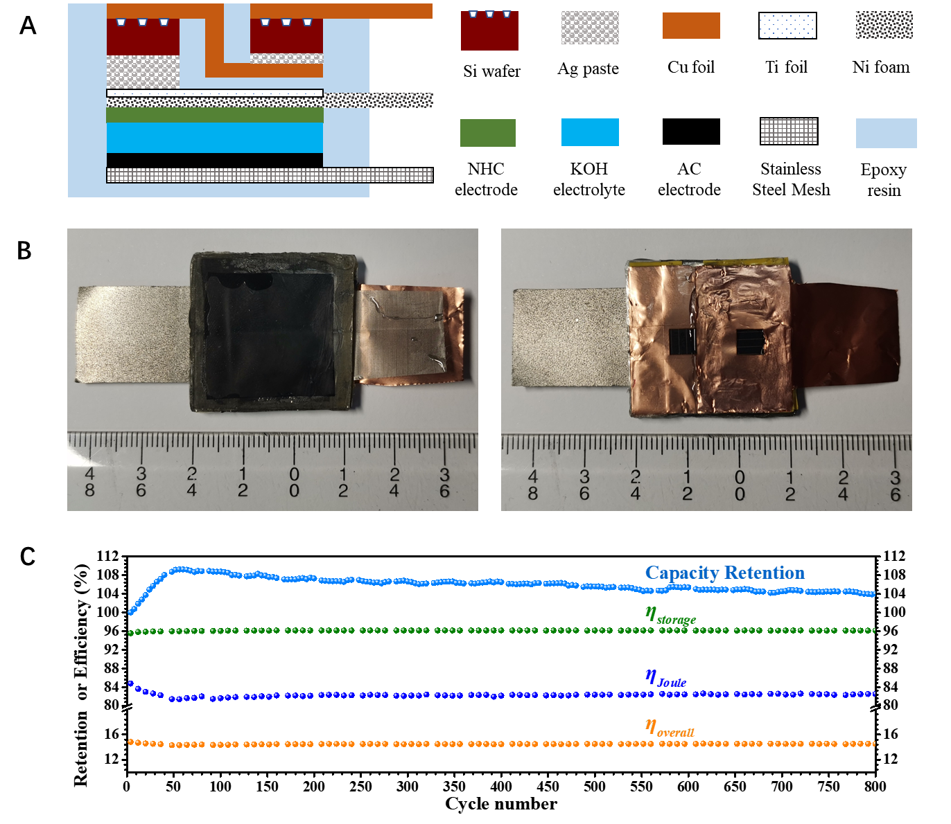 图一. 光电容器(IPC)的原理图和循环性能图。A. 由硅太阳能电池(SSC)和可调电压杂化超级电容器(VAHSC)组成IPC。B. IPC实物图。C. IPC在充放电800次循环中的电量保持率和效率变化曲线图。