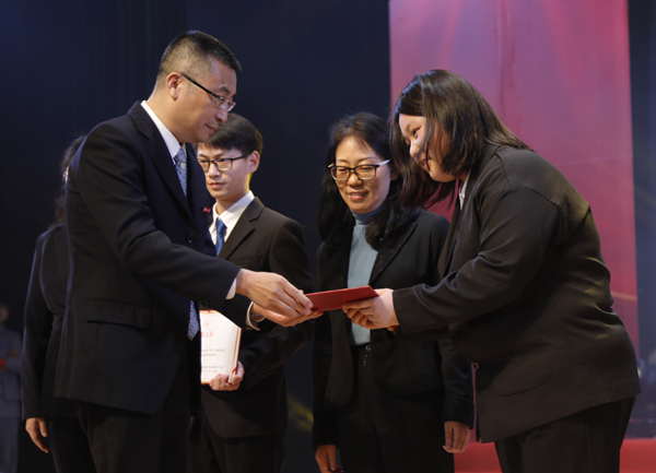 校长吴剑平在2021年“星光耀华园”颁奖典礼上为先锋模范标兵颁奖