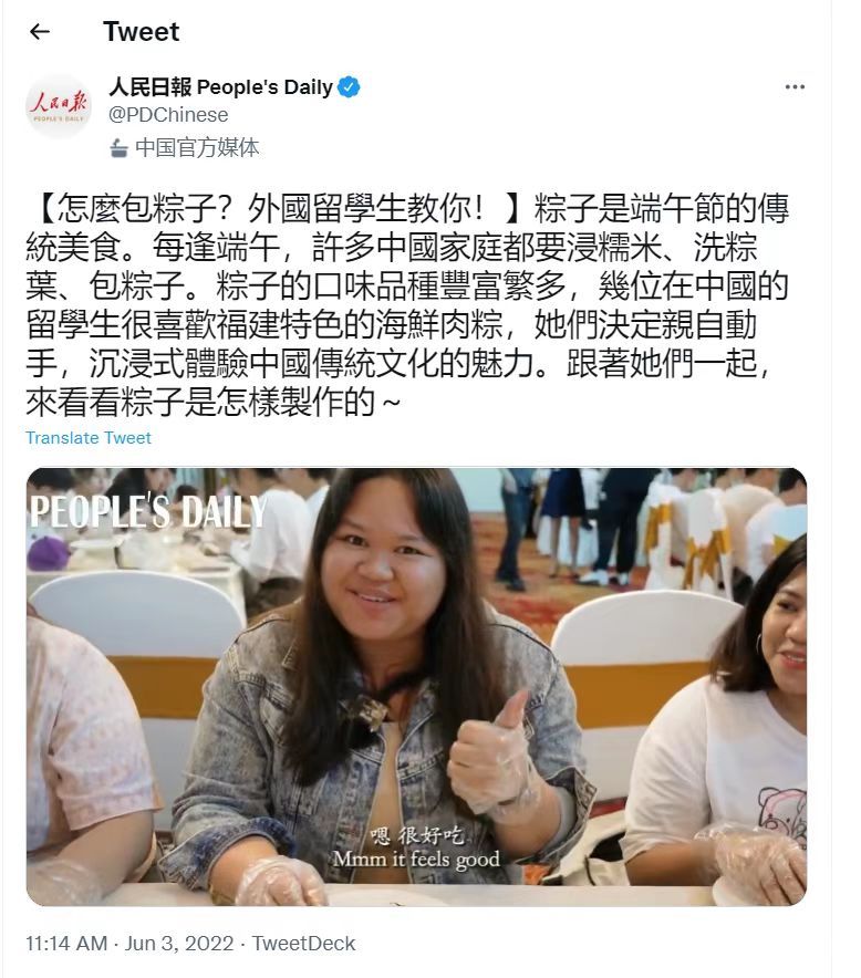 人民日报官方账号推送《菲律宾留学生沉浸式体验端午包粽子习俗》短视频
