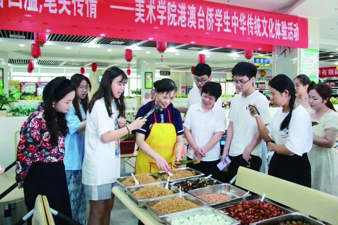 美术学院通过书画比赛、研修班、传统文化体验等多种形式,不断增进境外学生对中华优秀传统文化艺术的了解和认同感。每逢春节、端午节、中秋节等传统节日,学院都会组织境外生写春联、包饺子、捏汤圆、包粽子、做月饼等,让他们在活动中享受快乐,在快乐中学习、汲取中华传统文化滋养,增进文化认同。中国台湾学生徐嘉妤在参加完一场以“粽香四溢,笔尖传情”为主题的民俗文化体验活动后表示:“通过这次活动,我不但感受到了中华传统文化的魅力,还认识了很多境内生朋友,真的很开心。”