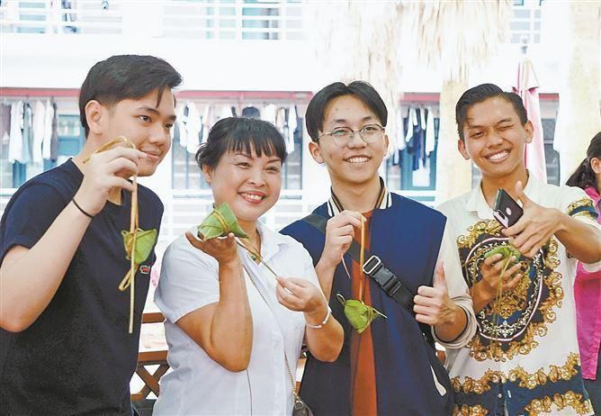 秘鲁留学生袁笑娟是第一次包粽子,“没想到包粽子看着简单,实际需要这么多技巧,做起来真不容易!”来自斯里兰卡的黄一一举起刚缝好的香囊和艾草挂件兴奋地拍照,“以前只是在电视上看过端午活动,今年终于能亲自体验,非常有趣!”
