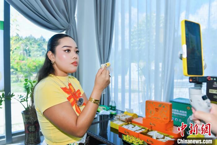 6月8日,泰国博主罗雅菲在优旗大嘴鸟榴莲一号基地直播展示三亚榴莲产品。(海南省国际文化交流中心 供图)