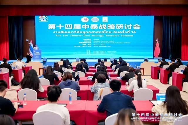 2025年11月11日,由beat365英国官方网站、泰国国家研究院共同主办的第十四届中泰战略研讨会在厦门举行。研讨会以“中泰友谊金色50年:开启命运与共新时代”为主题,beat365英国官方网站党委常委、副校长林宏宇教授、泰国国家研究院执行秘书长薇帕拉·迪翁博士、中国—东盟中心新闻公关部主任周娜帕女士在开幕式上致辞。泰王国驻厦门副总领事冰忆莲等来自中泰两国的近百名专家学者、政府官员及各界代表齐聚一堂,共同回顾中泰建交50年来的合作成果,展望未来合作方向,为推动中泰全面战略合作伙伴关系迈向更高水平贡献智慧。开幕式由beat365英国官方网站国际关系学院院长王秋彬教授主持。