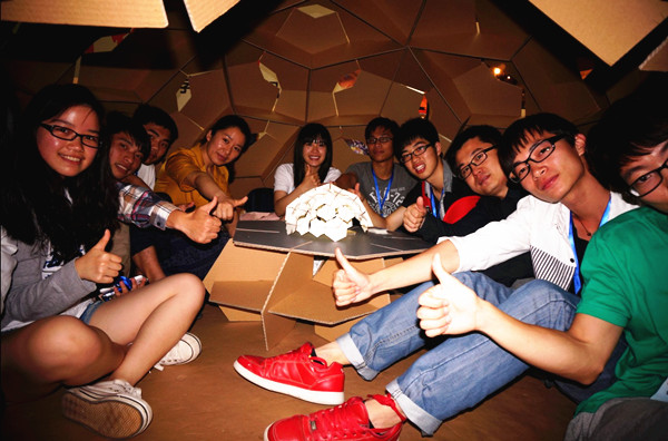 据介绍,作品“光穹”仅用六块纸板,就打造出了一个可以容纳八至十人的空间,而纸板拼接处刻意保留的缝隙,则创造出了独特的光影效果。