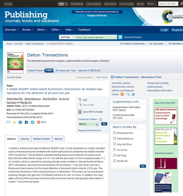 近日,beat365材料科学与工程学院2011级应用化学专业学生潘中华在骆耿耿老师的指导下,以第一作者身份在无机化学领域著名刊物《Dalton Transactions》(《道尔顿会刊》)在线发表题为“A simple BODIPY-aniline-based fluorescent chemosensor as multiple logic operations for the detection of pH and CO2 gas”(8号位为苯胺连接的氟硼吡咯荧光化学传感器件可作为多个分子逻辑操作检测较低pH范围及CO2气体)的研究论文(DOI:10.1039/C4DT00395K)。