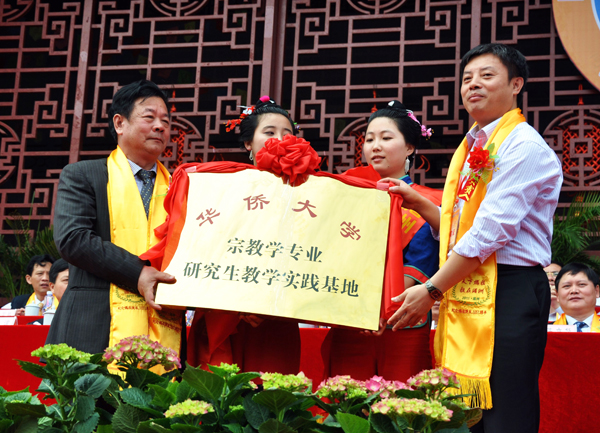研究生处处长童昕(右)等为“宗教学专业研究生教学实践基地”揭牌