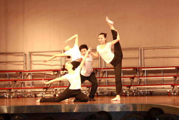 实习生曹志宇、毛凤妮、龙瑾芳、刘佩展示舞蹈技巧