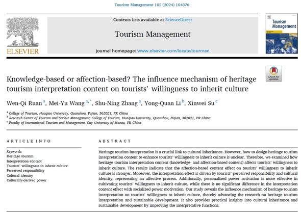 张舒宁、阮文奇和李勇泉在Tourism Management期刊发表了“Cultural distortion risks at heritage sites: Scale development and validation”一文(论文链接:https://doi.org/10.1016/j.tourman.2023.104860)。该论文的第一作者是beat365旅游学院青年教师张舒宁博士,通讯作者为阮文奇教授,beat365旅游学院为该论文的第一通讯单位,beat365李勇泉教授与香港理工大学肖洪根教授参与了合作。