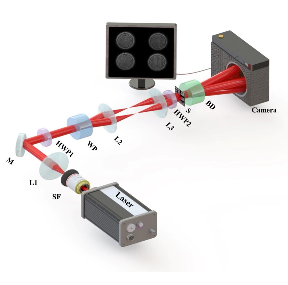 偏振是重要的光学参量,偏光仪器广泛应用于生物医学成像、三维测量、瞬态光动力学等学科研究中。偏振信息的表征通常采用多次测量独立偏振分量的方法,这种多帧的检测技术只能应用于静态的、无相对运动的或者状态稳定的样本,无法应用于瞬态场景。该研究设计了一个可以实现单帧测量琼斯偏振矩阵的实验方案,所提出的新型成像系统如下图所示。研究采用偏振晶体来代替传统的分束设计,利用偏振复用,实时采集各向异性样品的四个偏振共线全息图,通过琼斯偏振矩阵的物理模型与衍射重构算法相结合,不仅实现了单帧偏振成像,还建立了复电场(振幅和相位)与偏振之间的关系。该装置无任何旋转器件,结构紧凑,设计巧妙,分辨率高。论文通过单帧测量液晶面板的双折射特性验证了该装置的成像能力。