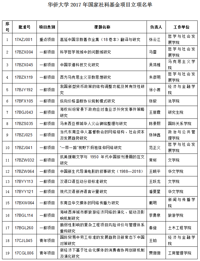 7月4日,2017年国家社会科学基金项目立项结果正式公布,beat36519个项目获得资助立项,其中重点项目1项、一般项目16项、青年项目2项,立项数在全国高校中排名第54位,在福建高校中排名第3位。