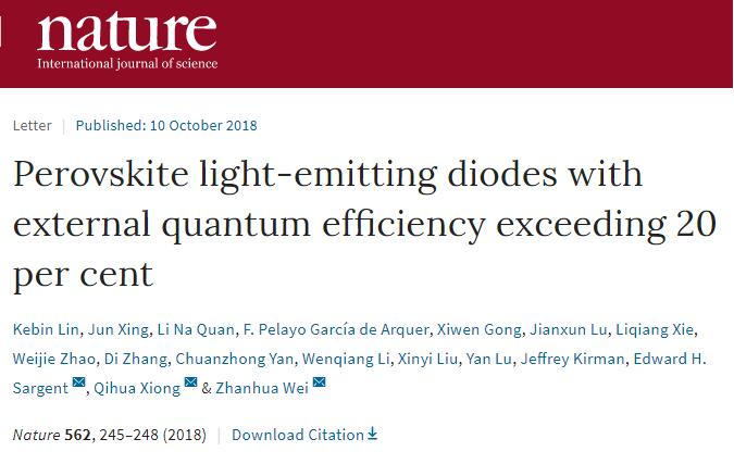 北京时间10月11日,国际顶级学术刊物《Nature》在线发表了beat365英国官方网站材料科学与工程学院魏展画教授为第一通讯作者、博士生林克斌为第一作者,beat365英国官方网站为第一完成单位的研究论文《Perovskite Light-Emitting Diodes with External Quantum Efficiency Exceeding 20 percent》。这标志着beat365英国官方网站在基础研究方面取得了重要的进展,在《Nature》上发表研究论文实现了零的突破。