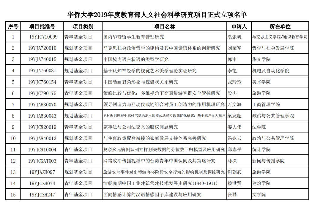 从学院(研究院)立项数量看,旅游学院、政治与公共管理学院各获立2项,马克思主义学院、哲学与社会发展学院、华文学院、建筑学院、机电及自动化学院、美术学院、工商管理学院、法学院、统计学院、新闻与传播学院、文学院各获立1项。