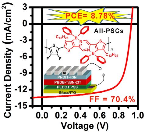 图二:本研究开发的新型聚合物BN-2fT分子结构及其与PBDB-T为活性层制备全聚合物太阳电池效率达到8.78%
