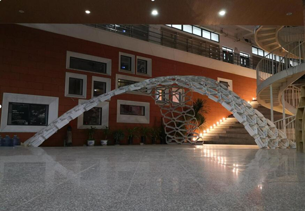 日前,建筑学院在李朝耀实验大楼中庭自行设计并制作完成一座3米高、7米跨度的拱形结构模型。此模型为省内第一个全3d打印而成的大跨结构模型,设计上采用逆吊法的力学原理,通过参数化编程自动生成拱形形态;技术上通过加装在工业机器人上的自制大型3d打印头加热PP(聚丙烯)合成塑料后采用FDM(熔融层积)技术打印而成。整体模型打印耗时近200个小时,总共完成176个不同形态的打印单元后拼装而成。此次模型制作充分体现了在数字大平台下,多学科跨专业的研究对建筑传统的设计与建造方式所带来的推动作用。