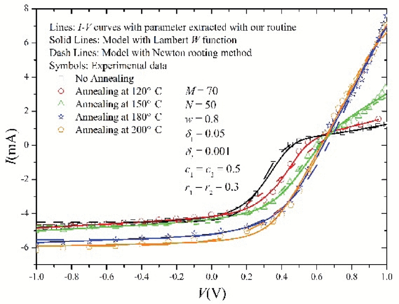 有机太阳能电池与传统太阳能电池相比具有诸多优势,如重量轻、成本低、制造工艺简单、柔性衬底、宽光谱吸收特性、半透明性等,有望作为下一代电子产品得到广泛应用。近年来,有机太阳能功率转换效率(PCE)的研究越来越受到重视。然而, S形的I-V特性至今仍困扰着有机太阳能电池性能的改进和实际应用。为准确描述其I-V特性,一个通用的参数提取算法对于具有较多参数的I-V模型具有重要的意义。