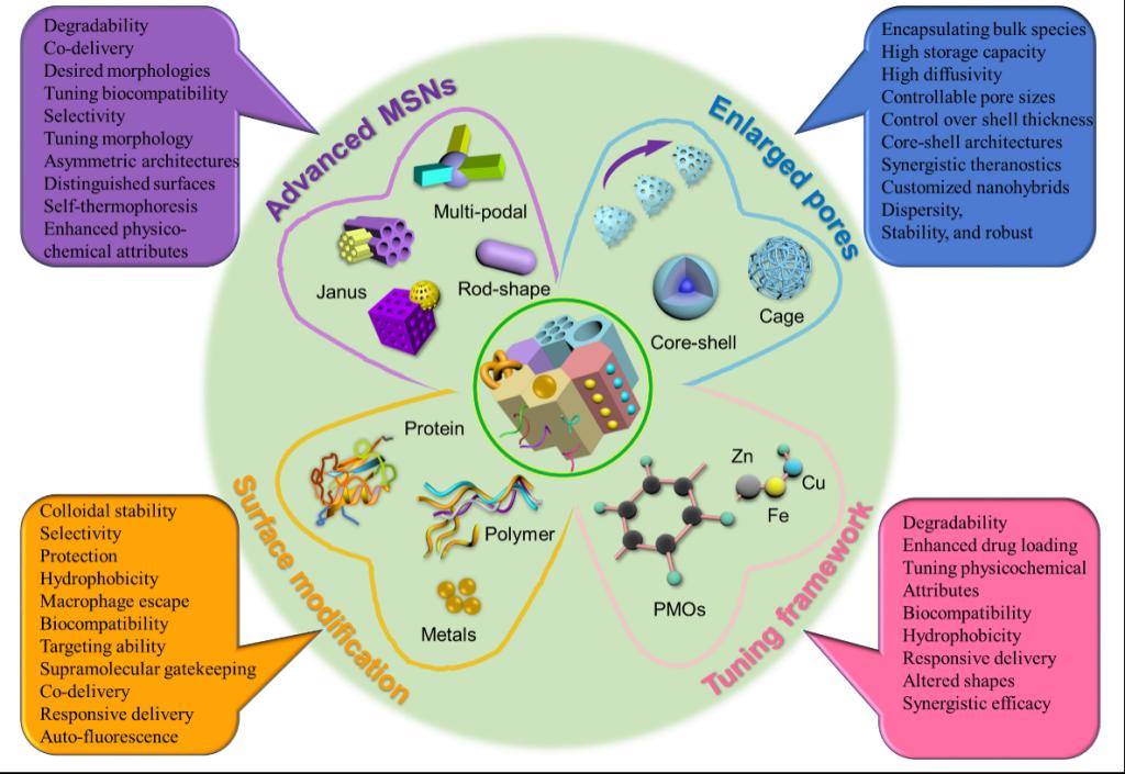 该论文对介孔二氧化硅纳米颗粒(Mesoporous Silica Nanoparticles, MSNs)过去20年的关键研究状况和最新突破进展进行系统综述,结合超分子组件、金属物质及偶联物,重点讨论表面修饰、硅质骨架改造和孔结构调控对MSNs物理化学性质的优化,阐明涉及反应动力学和影响因素的机理作用。此外,文章对先进MSNs复合材料的工程学应用进行展望,并探讨亟待解决的问题和面临的多重挑战。
