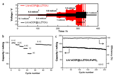 (a)有/无COFs修饰层的对称锂金属电池的循环性能对比。(b)有COFs修饰层的全电池的倍率性能及(c)循环性能。