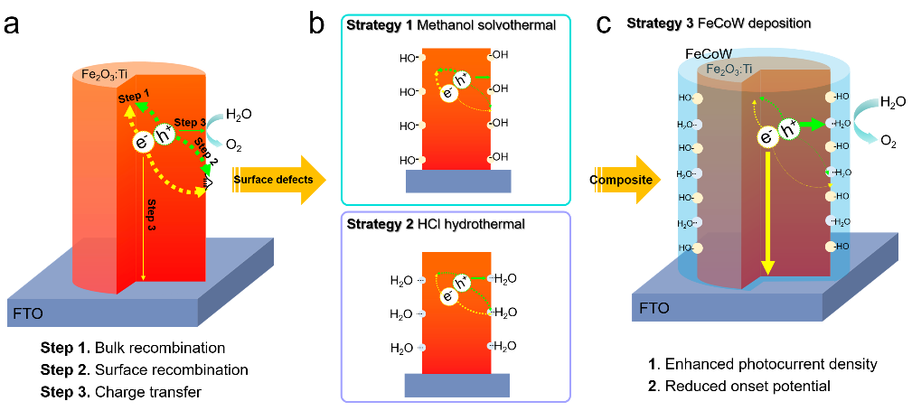 α-Fe2O3具备优良的半导体性质,在PEC水分解领域的应用潜力很大。探索提升α-Fe2O3光阳极的PEC性能的技术路线一直是相关领域的热点和难点。该论文提出了一条简易高效的性能改进路线。具体来讲,以水热合成的Ti掺杂α-Fe2O3 (Ti:α-Fe2O3)纳米棒结构光阳极出发,通过甲醇溶剂热法在Ti:α-Fe2O3中引入氧空位,提升载流子浓度,促进电荷分离。由于表面氧空位被OH-官能团占据,材料的表面亲水性显著增强,抑制了表面电荷复合,最终实现光电流的显著提升。而且,提高溶剂热温度可以引入更多氧空位,并且调节表面电荷复合速率,从而平衡光电流密度和开启电压。另外,通过稀盐酸水热法可在α-Fe2O3表面引入另一种氧缺陷,由表面吸附氧占据。表面氧缺陷的存在不仅提升了表面态位置使开启电压降低,而且提升表面态中电荷转化速率,一定程度上提升光电流。