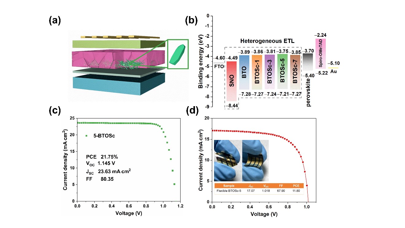 (a) 电池器件结构示意图;(b)Sc3+调控的SnO2/板钛矿TiO2支架可有效地调整能级排列并改善器件内部载流子动力学;(c)刚性PSC最佳PCE达到21.75%;(d) 柔性PSC最佳PCE达到11.80%,充分证明所设计功能层的普遍适用性。
