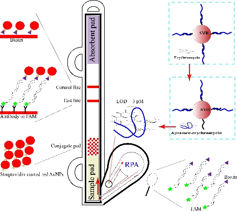 近日,beat365医学院2018级硕士研究生杜烨芃以第一作者在国际权威期刊 Biosensors & Bioelectronics 上发表题为“Preparation of DNA aptamer and development of lateral flow aptasensor combining recombinase polymerase amplification for detection of erythromycin”的研究论文。这是医学院林俊生教授课题组在小分子适体领域的又一重要进展。