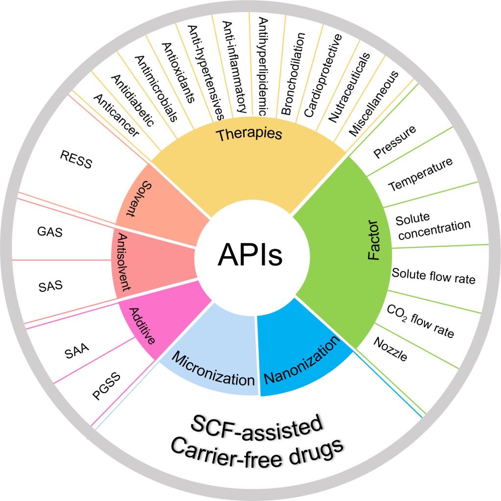 该论文对基于超临界流体技术制备药物颗粒的制备方法和研究情况进行了系统综述。文章以超临界二氧化碳作为抗溶剂、溶剂、辅助剂制备药物颗粒的三种方法为出发点,对这些方法进行了详细的分析和总结,并重点讨论了二氧化碳流速、溶剂流速、溶剂浓度、温度、喷嘴、压力等对药物颗粒的影响。同时,文章也系统地分析了超临界流体技术制备过程对药物自身性质的影响,并详细总结了超临界流体技术在制备不同类型药物的应用。此外,文章对超临界流体技术在药物领域的应用进行展望,并探讨了其在产业化及临床转化方面亟待解决的问题和可能解决的方法。
