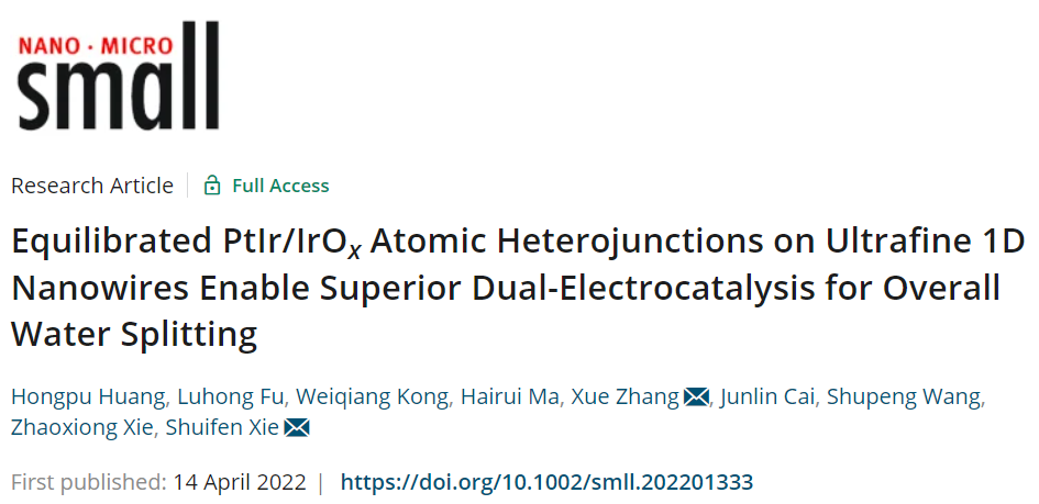 4月14日,《Small》期刊发表了团队题为“EquilibratedPtIr/IrOxAtomic Heterojunctions onUltrafine1DNanowiresEnableSuperior Dual-Electrocatalysis for Overall Water Splitting”的研究论文。该工作通过简单一步法制备了直径仅约为2 nm的PtIr/IrOx复合纳米线(NWs),借助原位氧化过程在超细纳米线表面形成丰富的Pt/IrOx原子异质结(AHJs),实现了高效双功能电催化全解水。理论计算结果表明,原子级耦合的Pt-IrOx双位点有利于促进水的解离,能够削弱Pt位点上H*的吸附强度,并反向调节OH*在桥式Ir–Ir位点上的吸附和氧化。通过精准调控Pt/IrOxAHJs的比例,分别优化了阳极HER和阴极OER反应动力学。基于最佳性能的PtIr/IrOxNWs催化剂组成的电极对仅在1.52 V的电池电压下就能够实现持续产氢。该工作在谢水奋教授(通讯作者)指导下,由beat365博士生黄虹浦(第一作者)和付露红博士(共一)等人员共同参与完成。中科院深圳先进技术研究院张雪博士负责了两篇论文中的理论计算工作。