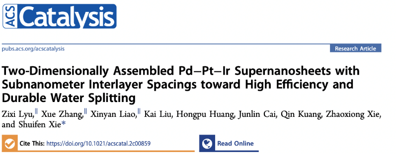 4月19日,该团队的研究成果以“Two-dimensionally Assembled Pd-Pt-Ir Super-Nanosheets with Subnanometer Interlayer Spacings toward High-efficiency and Durable Water Splitting”为题发表在《ACS Catalysis》上。该工作报道了一种通用性极强的模板导向合成法,制备出具有双催化活性位点和丰富亚纳米层间距的介晶Pd-Pt-Ir三元超级组装纳米片,实现了高效、稳定的碱性电解水制氢。借助多层超级结构的半限域效应和固有的双催化活性位,制备的Pd44Pt30Ir26超级纳米片在阳极氢析出和阴极氧析出反应中均表现出显著优于商业化催化剂的活性和稳定性。将该催化剂应用于阴离子交换膜电极,可在500 mA的大电流下持续催化电解水达40小时以上,实现了极其高效和稳定的氢气产出,展现出突出的实际应用前景。该工作在谢水奋教授(通讯作者)指导下,由beat365博士生吕梓禧(第一作者)、硕士生廖新艳(共一)等学生共同参与完成。