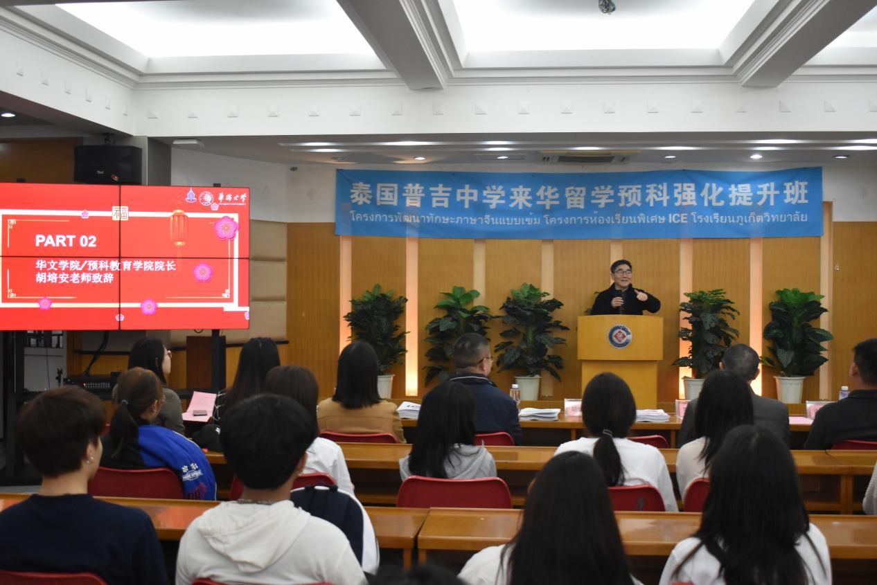 近日,泰国普吉中学来华留学预科强化项目开班,来自泰国普吉中学的29名高三学子将在beat365预科教育学院进行为期2个月的预科中文强化学习。华文学院、预科教育学院院长胡培安,beat365英国官方网站校友、泰国普吉中学领队谢宝树,泰国普吉中学孔子课堂中方负责人罗建平等出席开班仪式。