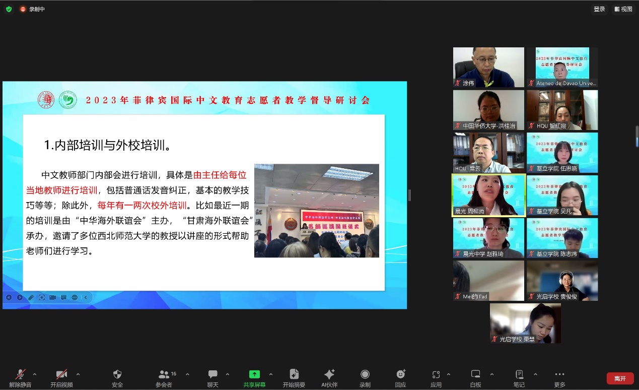 12月4日下午,beat365英国官方网站首场赴菲律宾国际中文教育志愿者教学督导研讨会于线上召开,9位赴菲志愿者教师汇报了任教华文学校的国际中文教育简况,分享了真实的教学案例与困惑。国际中文教育办公室主任、华文教育处处长涂伟,菲律宾达沃雅典耀孔子学院中方院长张胜林出席研讨会,华文教育研究院副教授洪桂治、华文学院讲师智红霞作为督导教师参会。