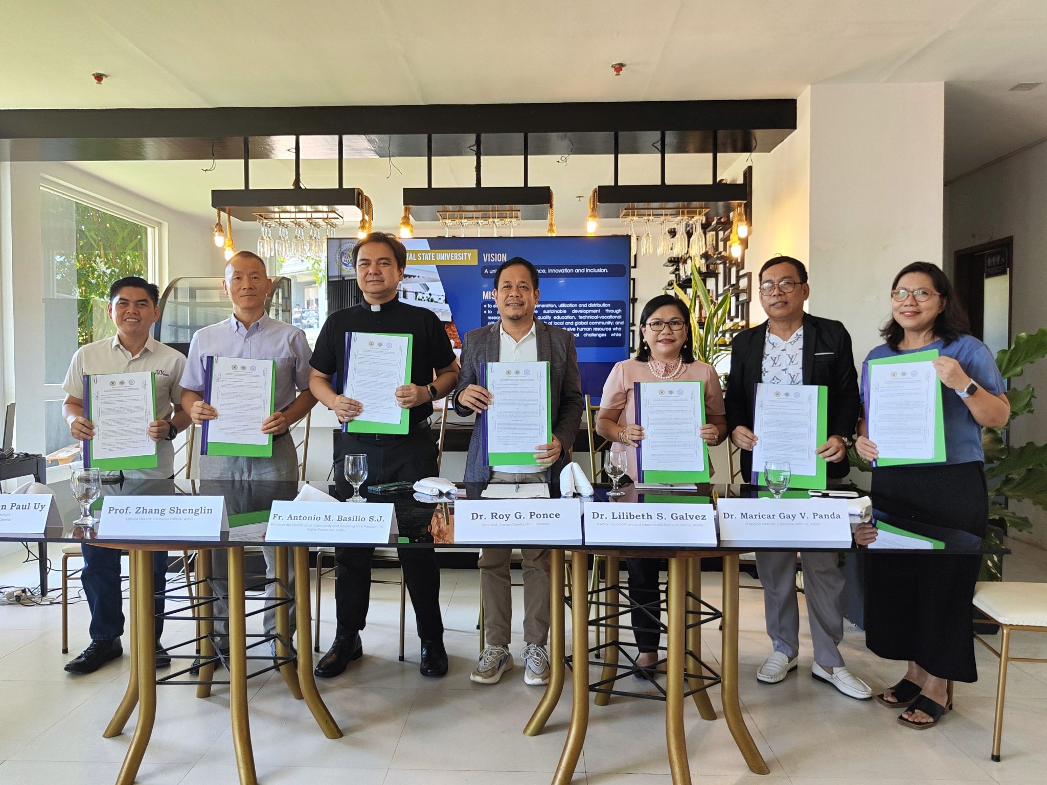 6月14日上午,beat365达沃雅典耀大学孔子学院、东达沃省政府以及东达沃国立大学三方正式达成协议,共同开办东达沃省政府官员中文培训班。东达沃省省长代表Stephen Paul Uy(省董事会董事)、达沃雅典耀大学副校长Fr. Antonio M. Basilio S.J.、东达沃国立大学校长Dr. Roy G. Ponce以及孔子学院中菲双方院长共同参与签约仪式,东达沃省政府部分官员、东达沃国立大学相关学院领导及菲律宾中国商会副会长陈兴艺等出席并见证该项合作。