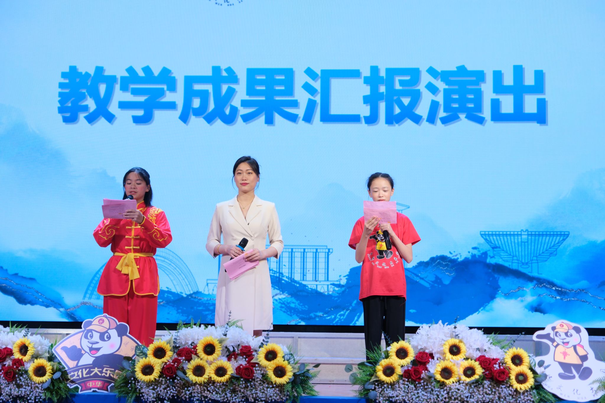 闭营式上,学员们汇报展示学习成果,包括舞龙、排舞、快板、舞蹈、走秀与书法国画手工作品展示,融合合唱、打击乐与排舞、主题朗诵、中华武术、AI主题表演等多种形式。