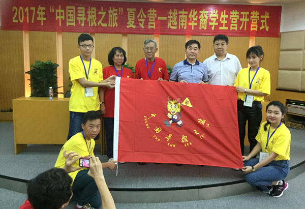 开营式上,胡培安为夏令营授营旗。他指出,此次寻根之旅活动主要是带领华裔子弟感受祖辈生活过的地方,领略中华文化,追寻自己的根。