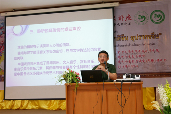 8月9日下午,由泰国普吉中学孔子课堂和宋卡王子大学孔子学院联合举办的中华戏曲艺术讲座在普吉中学开讲。西南大学文学院刘叙武博士和重庆市川剧院青年武生、国家一级演员饶春,共同为普吉中学孔子课堂的师生们带来了一场精彩纷呈的中华戏曲盛宴。