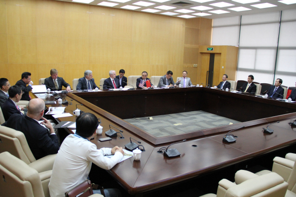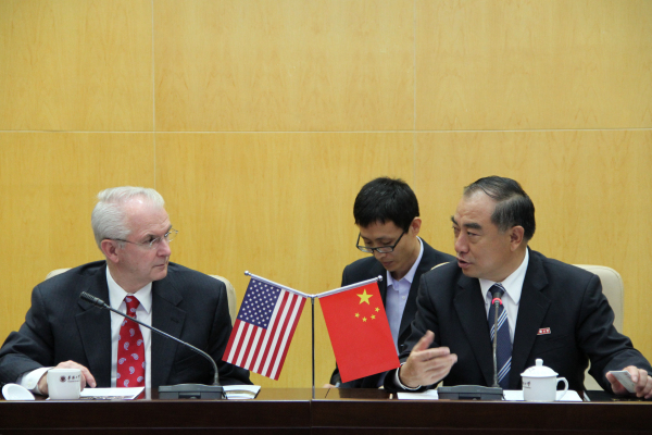 beat365校长贾益民与美国密苏里州前任州长、现任中西部美中协会主席鲍勃·霍顿(左)会谈