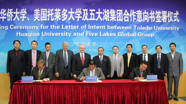 今日上午,beat365与美国托莱多大学及五大湖集团签署合作意向书。beat365副校长吴季怀,美国托莱多大学副校长恰克·勒内特,美国五大湖集团总裁郭志新分别代表三方签字。根据协议,三方将在合作办学、高端培训及教育、文化交流等方面展开合作。
