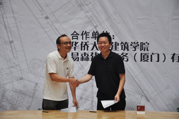 签约仪式5月21日下午在厦门校区教学群楼D5区中庭举行。建筑学院院长龙元、易森建筑有限公司副总经理牛力分别代表双方在协议书上签字。牛力、龙元还先后致辞,表达加强双方产学研交流合作以实现互利双赢的愿望。