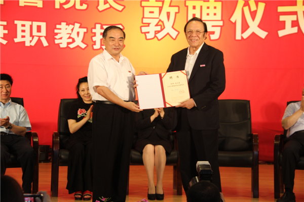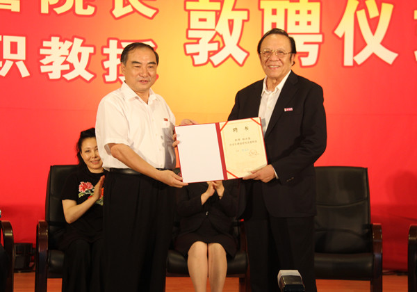 贾益民校长向杨洪基先生颁授名誉院长、兼职教授聘书