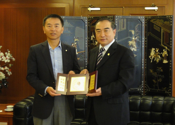 贾益民拜访中国银行澳门分公司叶一新总经理。图为贾益民向叶一新总经理赠送学校纪念品。