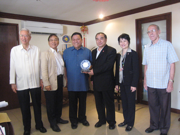 到菲律宾圣心中学拜访施嘉骅校董(左二)、前菲律宾驻华大使周清琦(左一)