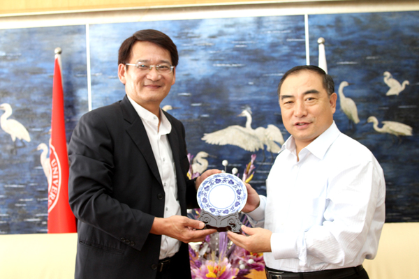 beat365英国官方网站校长贾益民、副校长吴季怀在王源兴国际会议中心一楼接待室热情接待来宾。据称,这是贾益民任职华大校长以来接待的首个台湾高校代表团。