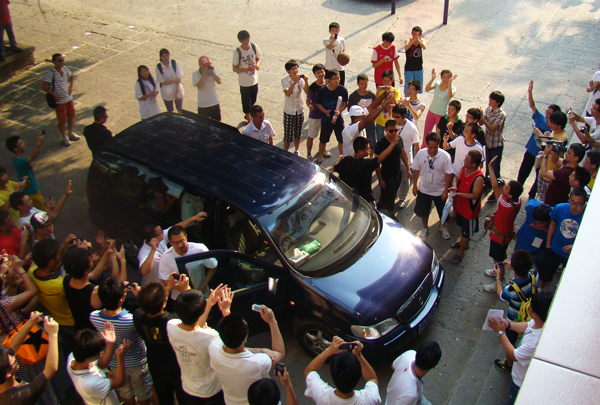 华大球迷在莲雪楼下热情欢迎海耶斯到来