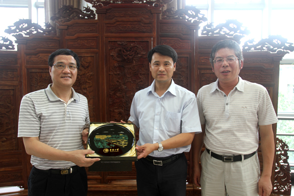 副校长张禹东向沈阳建筑大学党委副书记王强(中)赠送纪念品