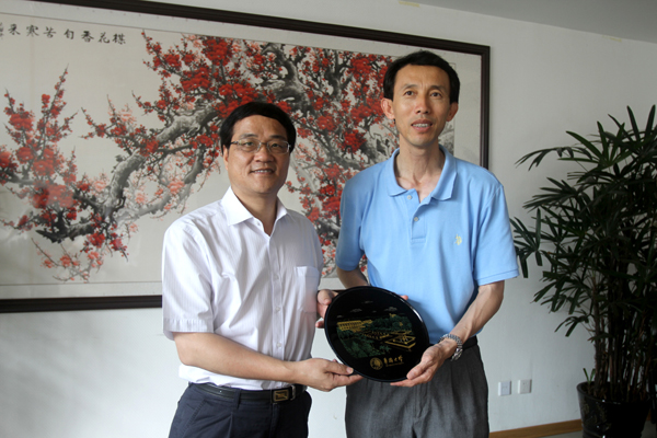 副校长张禹东向大连民族学院院长刘玉彬赠送纪念品