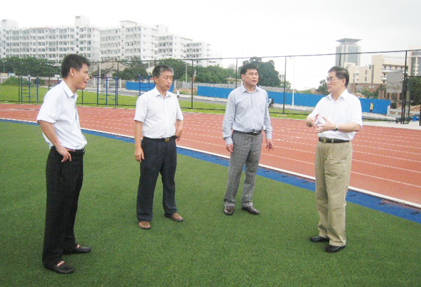 丘进校长(左三)、刘塨副校长(左二)陪同张志猛董事(左一)、吴辉体先生参观行政办公楼