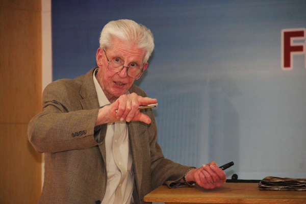 22日下午,Corbett教授在厦门校区王源兴国际会议中心为beat365师生作了题为“从Zintl相到极性金属间化物—探索合成上的西部之旅”的学术报告。在报告中,Corbett教授从Zintl相的定义出发,介绍了由活性金属和p区金属元素的还原反应合成遵循价电子八偶律的盐式二元金属间化物,到采用d区过渡金属元素、f区稀土元素调节电子/原子比例,而导致偏离Wade规则的缺电子极性三元金属间化物、准晶和拟准晶物相的固相合成之旅。精彩的学术报告把师生带入了一个奇妙的金属间化物的化学世界。讲座最后,Corbett教授还与师生进行了深入的讨论。
