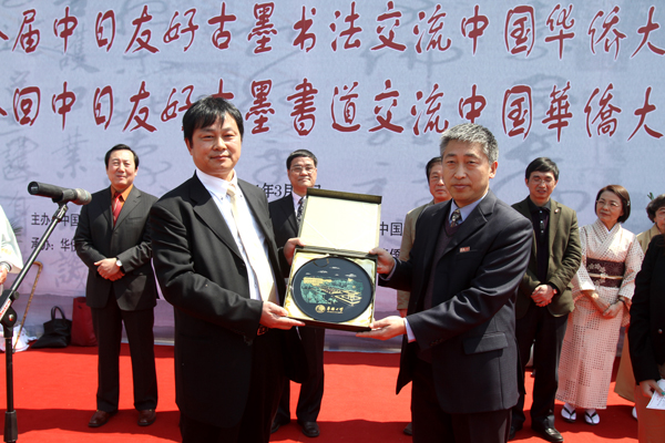 张禹东副校长、日中古墨书道友好协会常务副会长山羽好文代表双方先后致辞。张禹东热情欢迎出席本次书法盛会的中日书法家和各界来宾,期望与会的日本朋友带去华大师生对日本地震灾区人民的诚挚问候和美好祝愿,并祝愿他们早日渡过难关,重建家园。他再次呼吁和强调“艺术教育是大学教育主题应有之义,艺术在大学应该享有崇高的地位。”张禹东还回顾了中日文化尤其书法艺术交流的悠久历史,称赞中日古墨书道友好协会“架起了两国古墨传情的中日友好的桥梁”。他并介绍了华大50年来致力于与世界各国的文化交流情况,及首任校长廖承志为发展中日友好和改善两国关系所作的特殊贡献,称本次展览“对增强华大师生艺术修养和文化底蕴、对加深中日两国人民尤其是青少年之间的了解和增进友谊具有的重要意义。”山羽好文则诚挚感谢华大为本次展览付出的努力。