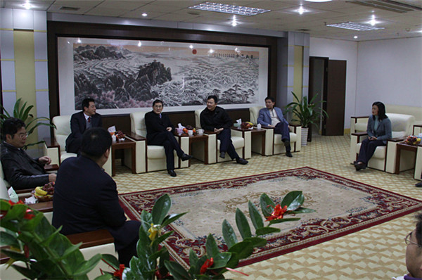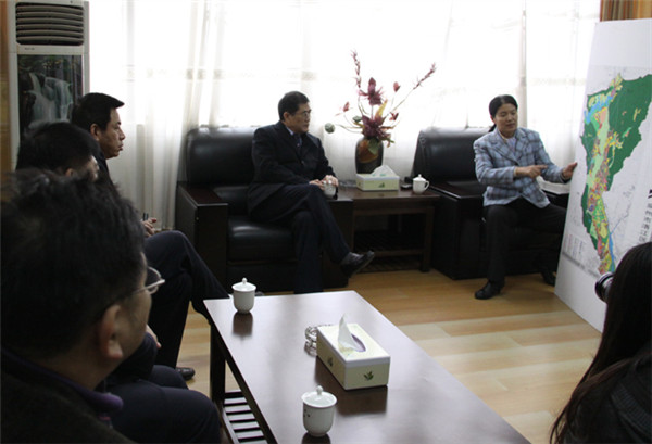 洛江区区委书记吕竞(右一)向丘进校长一行介绍洛江概况