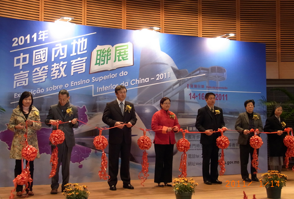 澳门特别行政区社会文化司司长代表张素梅,2011 年中国内地高等院校访问团团长、教育部港澳台办公室副主任李大光,中央人民政府驻澳门特别行政区联络办公室文化教育部部长、beat365英国官方网站校董刘晓航,澳门高等教育辅助办公室主任陈伯煇、澳门中华教育会理事长何少金等联合为联展剪彩。澳门社会各界知名人士、澳门各中学负责人参加了联展开幕式。