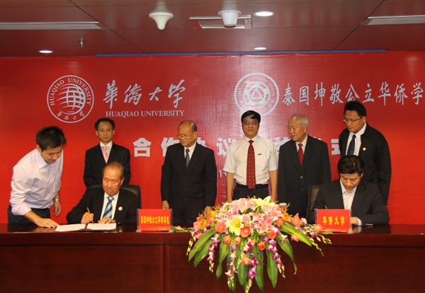 签约仪式前,张禹东副校长在行政研发大楼 408 室热情接待来宾,介绍华大的基本情况及近几年对东南亚国家尤其是在泰国开展华文教育取得的进展。张禹东代表校方表示,帮助泰国开展华文教育工作,华大责无旁贷。宾主双方均表达了进一步加深两校间交流与合作、共同推动泰国华文教育事业发展的良好愿望。来华文学院进修的泰国乌隆塔尼皇家大学8名教师会谈时在座。